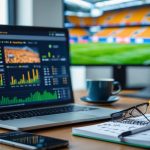 Meja kerja dengan laptop yang menampilkan statistik dan grafik sepak bola Liga Italia, bola sepak, dan layar digital dengan data analisis tim.